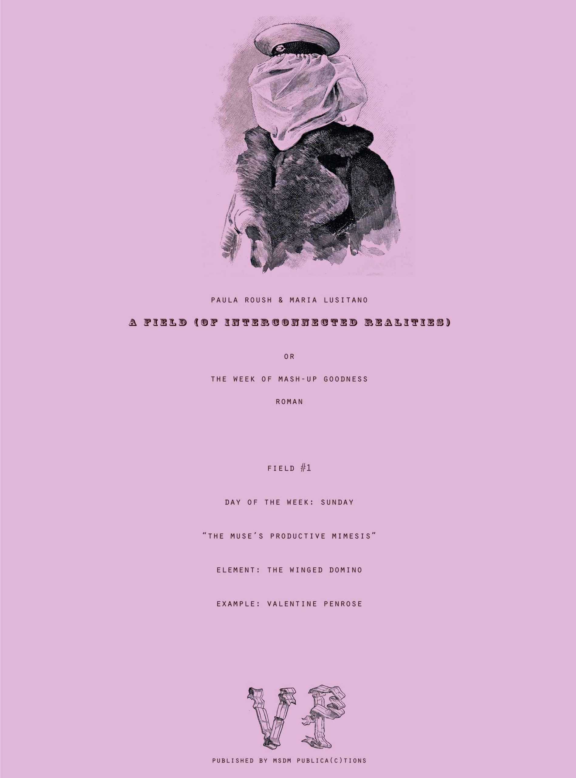 Field #5 combines the three remaining days. For Thursday, the element is The will of the work of art and this is represented with the text Ghostly edges: the uncanny and after life in Max Ernst’s collage novel Une Semaine de Bonté; For Friday, the element is Photography’s archival order and the example is The research scrapbook, a collection of visual material cut out and mounted on a four page spread. For Saturday, the element is The killing of aesthetic ideals and the example is the text Out there in the east: desire and gifts in Valentine Penrose’s collage-poem Dons des Féminines.