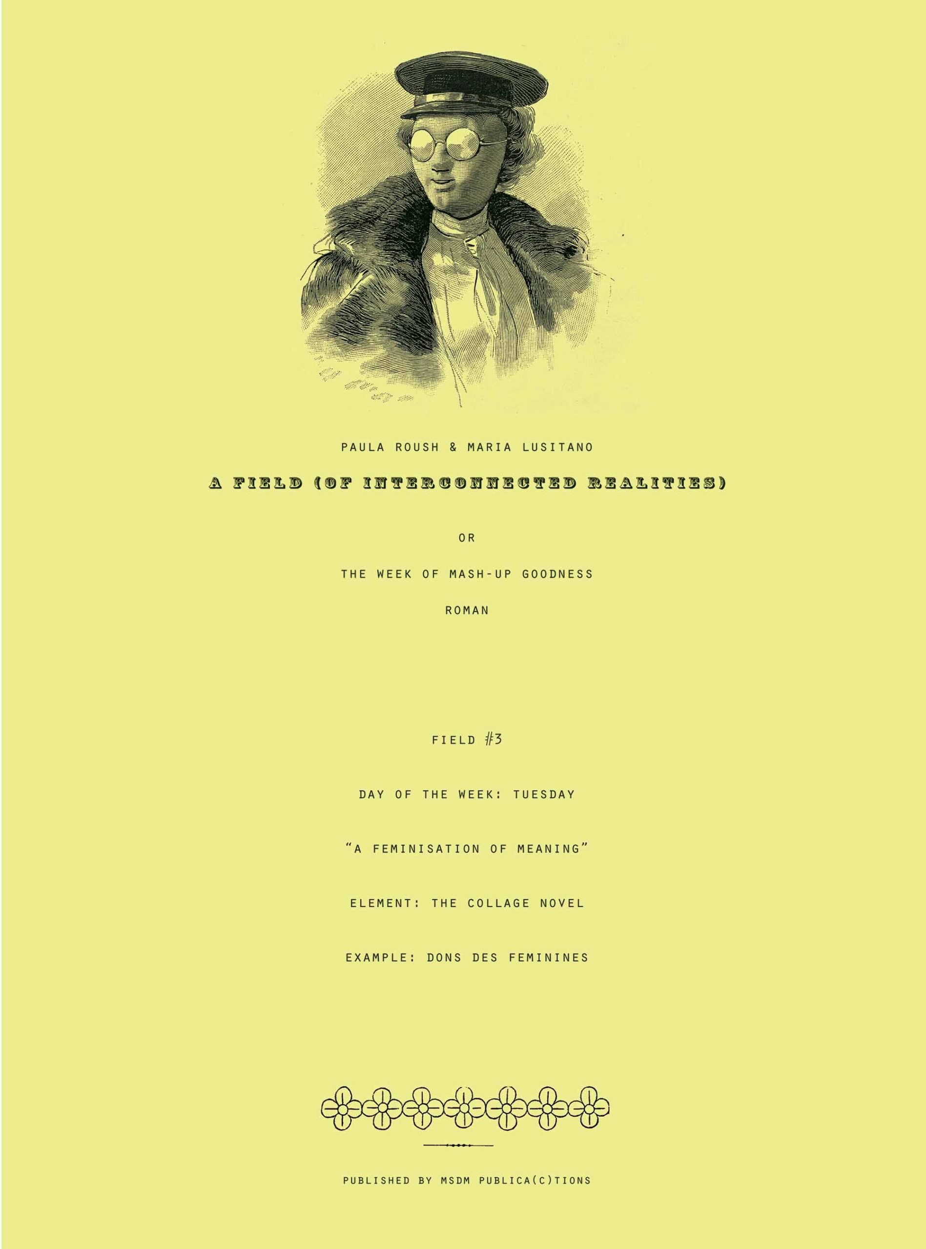 Field #3, the day of the week is Tuesday, the element is the collage-novel and the example is Dons des Féminines. Traces from Dons des Féminines are projected onto the skin, exploring the moment when the virtual page disappears into the body. It is subtitled A feminisation of meaning, and functions as a dialectical speculation on time, memory and the future of the book.
